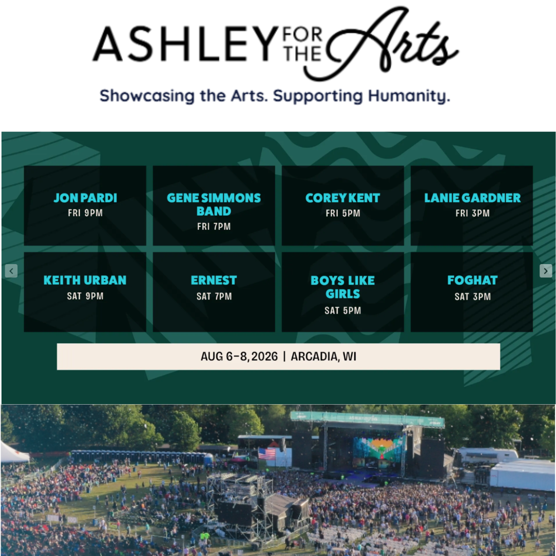 Ashley for the Arts takes place August 6-8 at Memorial Park in Arcadia, WI. Get your tickets today!
