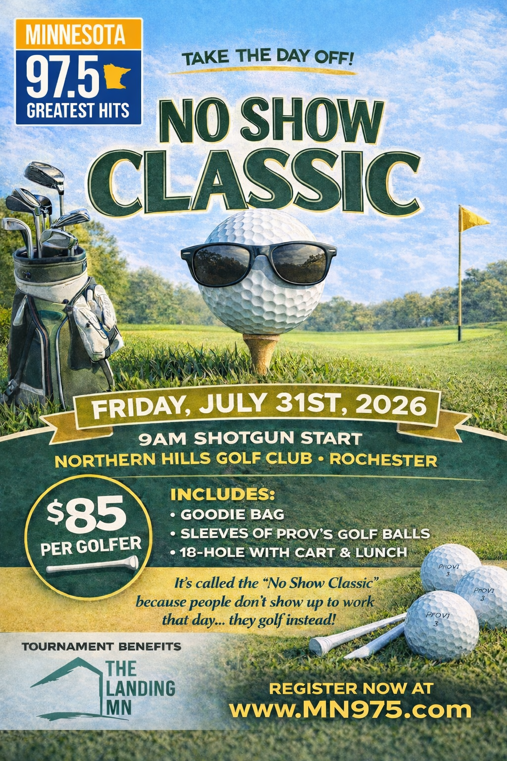 The MN 97.5 No Show Golf Tournament is Thursday, July 24th at Northern Hills Golf Club in Rochester (9am Shotgun Start). This event benefits The Landing MN.